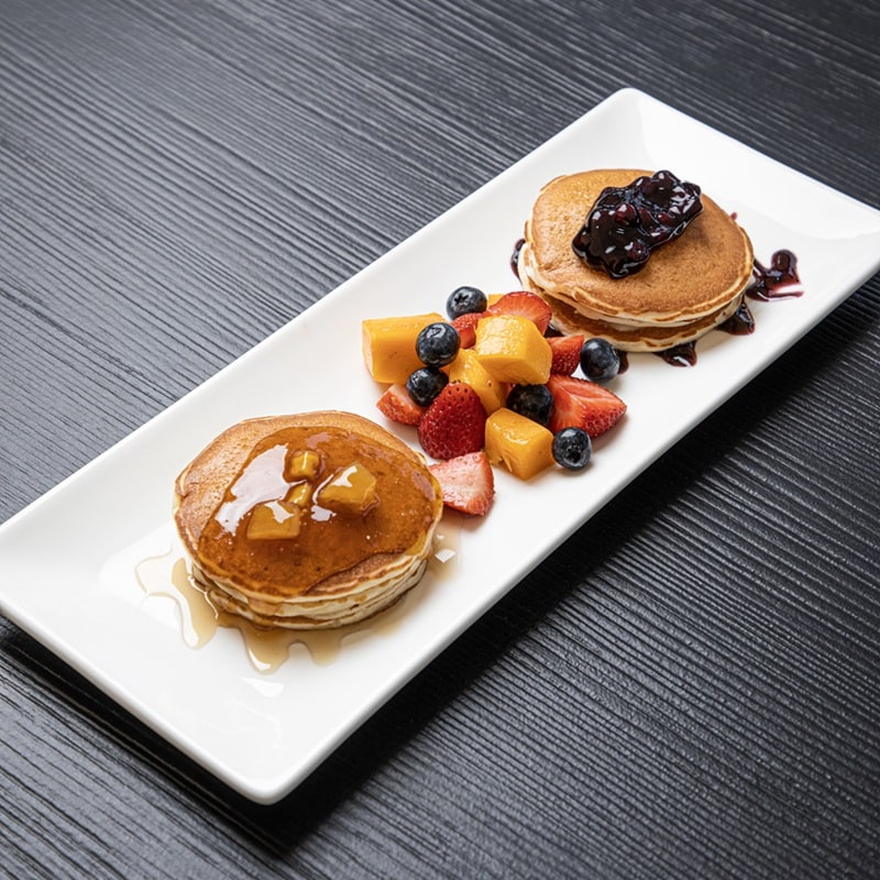 Three pancakes filled with cream cheese, topped with honey apricot. Three filled with cream cheese, topped with blueberry coulis. Served with fresh mango, strawberries and blueberries.