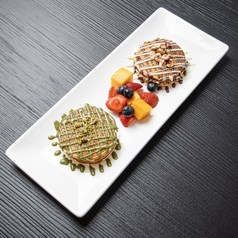 Three pancakes filled with Belgian chocolate, topped with Belgian and white chocolate. Three filled with pistachio paste, topped with pistachio syrup. Served with fresh mango, strawberries and blueberries.