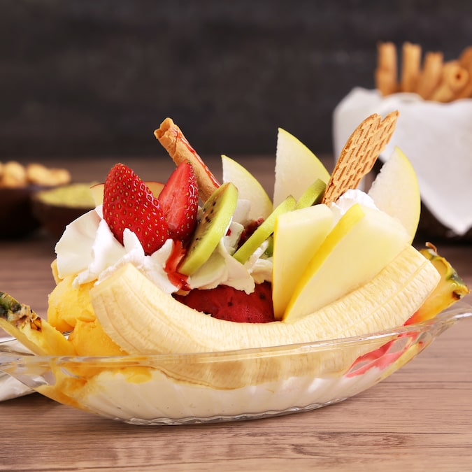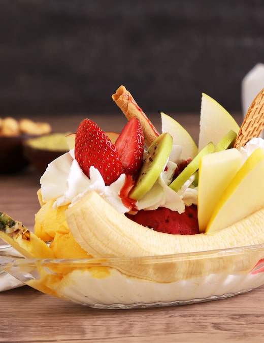 A covered plate of achy & bananas with 3 scoops of ice cream (fruit flavored) topped with fresh cream garnished with fruits.