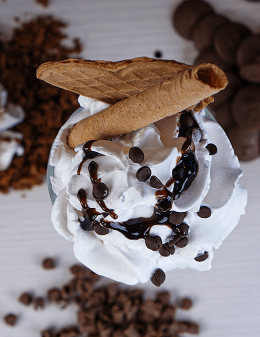 Chocolate ice cream mixed with milk topped with fresh cream and chocolate syrup