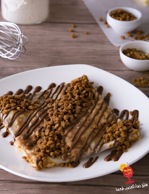 Speculoos spread crunchy, bananas, topped with milky chocolate and speculoos biscuits.