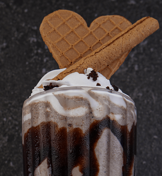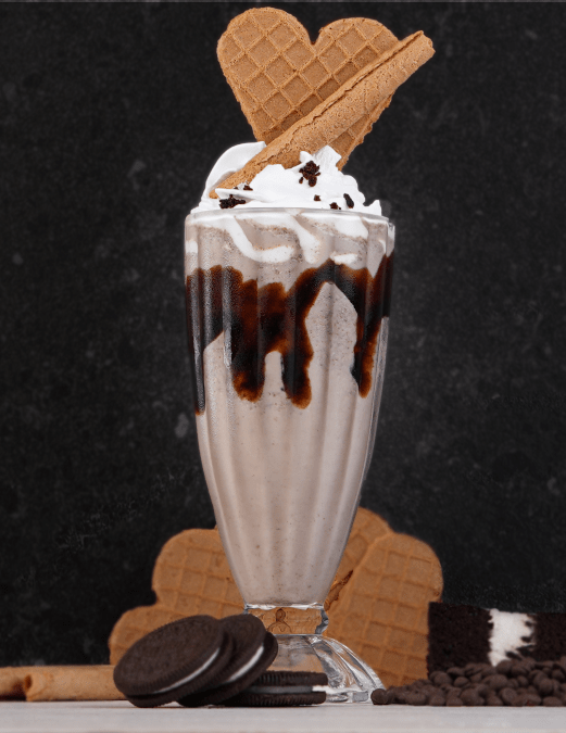 Oreo ice cream mixed with milk topped with fresh cream and chocolate syrup
