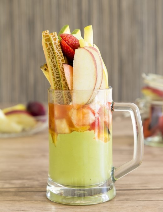 Combination of 10 kinds of fruits, avocado and 2 kinds of juices topped with achta, honey, nuts and decorated with fresh fruits.